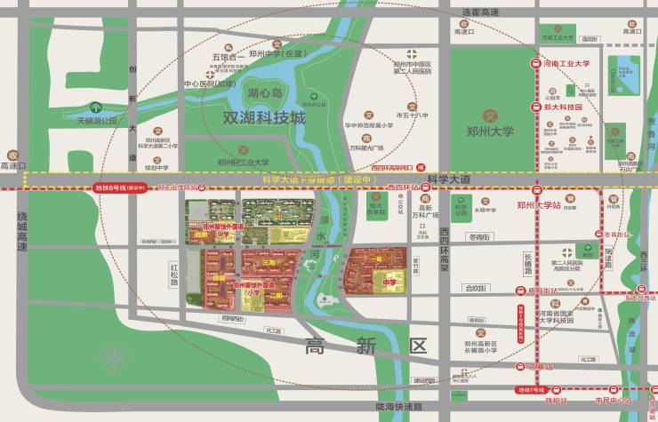 周边环伺地铁1号线(郑州大学坐-已运营)/8号线(轻工业大学坐-现已试运转)双地铁线,紧邻双湖科技城地方科技区(CID)科创金融岛;样板房。